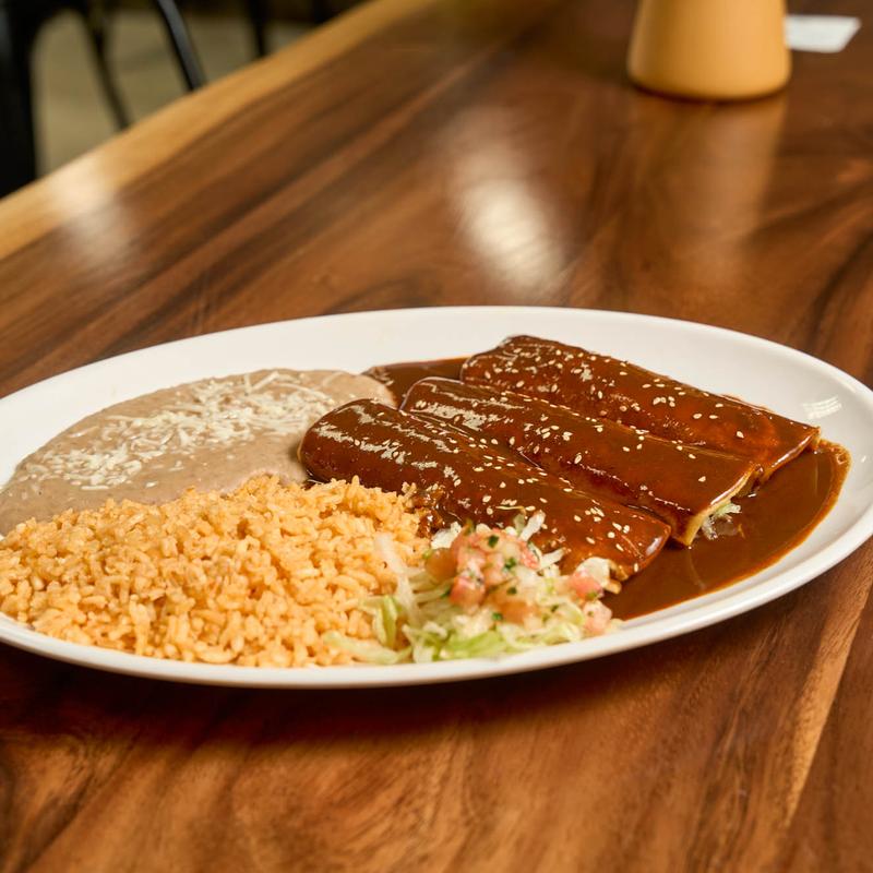 Mole Enchiladas served with Rice, Beans. CONTAIN PEANUTS